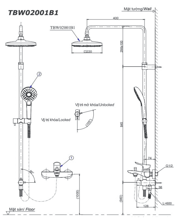 Thông số cơ bản Sen Cây TOTO TBW02001BA Nóng Lạnh