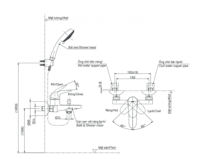 • Áp lực tối thiểu : 0.05 MPa (Áp lực động)