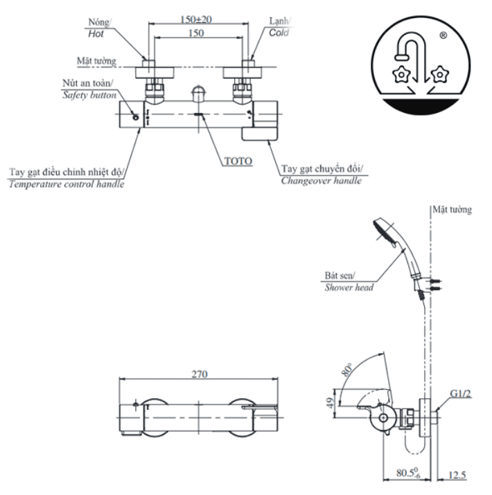 Bản vẽ kỹ thuật của sen tắm nhiệt độ TOTO TBW03002B/TBV03427V