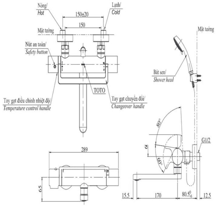 Bản vẽ kỹ thuật của sen tắm xả bồn TBV03429V/TBW01008A