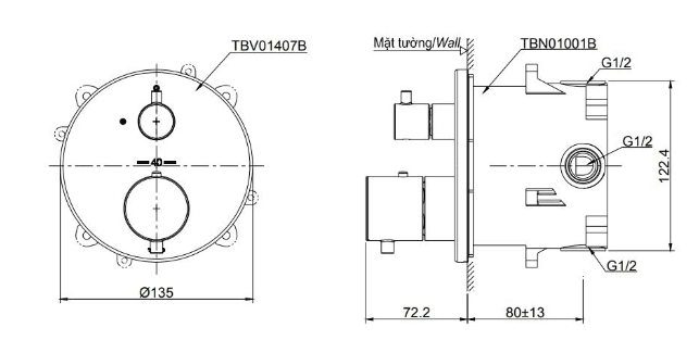 Thông số cơ bản của Van Âm Tường TOTO TBV01407B/TBN01001B Nhiệt Độ 2 Đường Nước