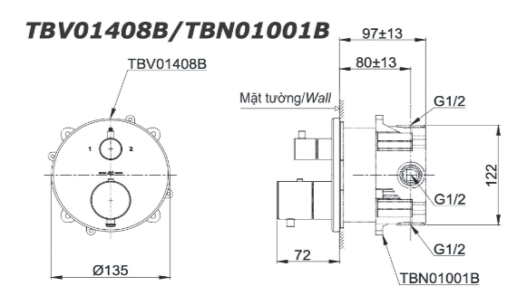Thông số cơ bản của Van Âm Tường TOTO TBV01408B/TBN01001B Nhiệt Độ 2 Đường Nước