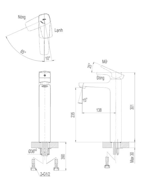 vòi chậu này có kích thước từ đỉnh vòi lúc đóng đến dáy là 301mm.