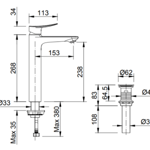 Dựa theo bản vẽ kĩ thuật các bạn có thể thấy đi kèm vòi chậu này là một trụ xả nhấn được làm bằng đồng mja ni/cr với chiều dài 108mm. Phi 62. Để được hỗ trọ liên hệ 091 9999 516 Mr Thịnh – 098 6666 516 Ms Vân