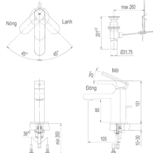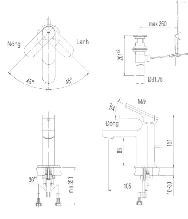 Vòi chậu này đã bao gồm một trụ xả ty làm bằng đồng mạ crom. Chiều cao của trụ xả ti 201mm. Là mẫu vòi chậu có chiều cao trung bình nên kích thước từ lỗ vòi đến đáy vào khoảng 85mm. chiều cao từ đỉnh đến đáy là 151mm