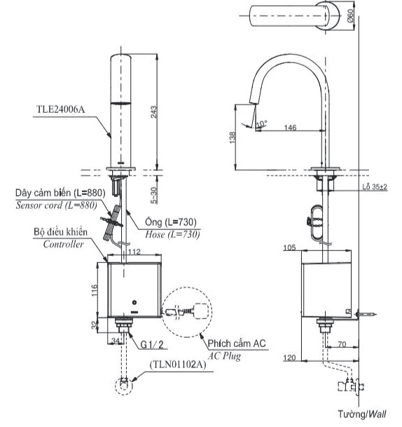 Thông số cơ bản của Vòi Lavabo TOTO TLE24008A Cảm Ứng Tự Động