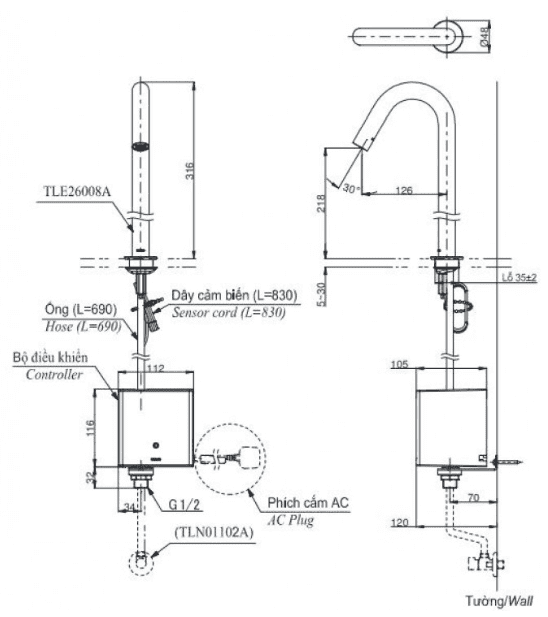 Thông số Vòi Lavabo TOTO TLE26008A Cảm Ứng Tự Động