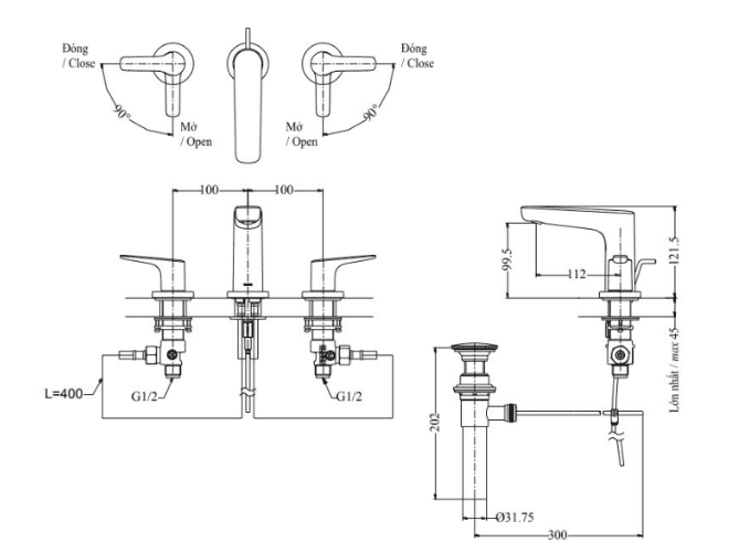 Bản vẽ Vòi Lavabo TOTO TLG03201BA Tay Vặn Nóng Lạnh GS (3 Lỗ)