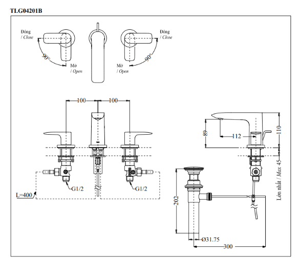 • Áp lực nước: 0.05MPa ~ 1.0MPa