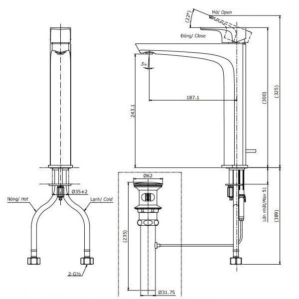 - Áp lực nước: 0.05 ~ 1.0 MPa.