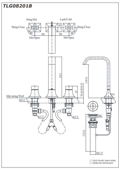 Bản vẽ Vòi Lavabo TOTO TLG08201B#BBR Tay Vặn Nóng Lạnh GC (3 Lỗ)