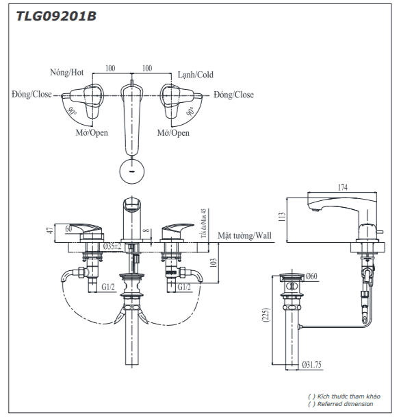Bản vẽ Vòi Lavabo TOTO TLG09201B Tay Vặn Nóng Lạnh GM (3 Lỗ)