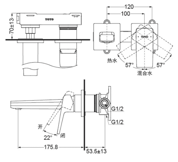 Bản vẽ Vòi Lavabo TOTO TLG10307BB Gật Gù Nóng Lạnh Gắn Tường GB (2 Lỗ)