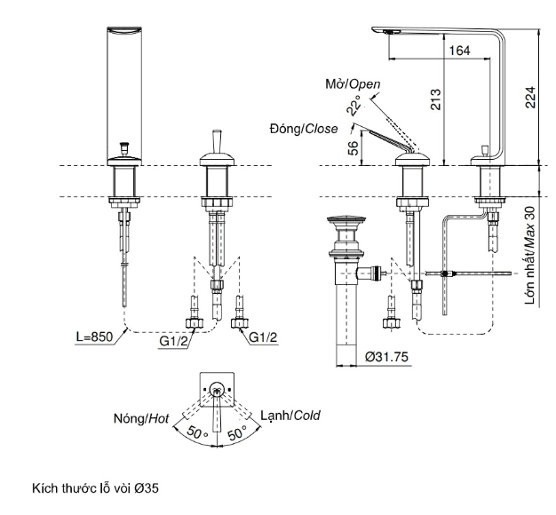 - Áp lực nước: 0.05MPa ~ 0.75MPa