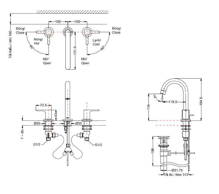 - Kích thước chiều cao vòi xả: 194.4 mm (H)
