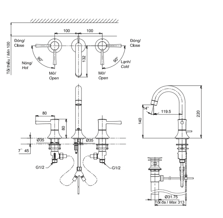 - Áp lực nước: 0.05MPa ~ 1.0MPa