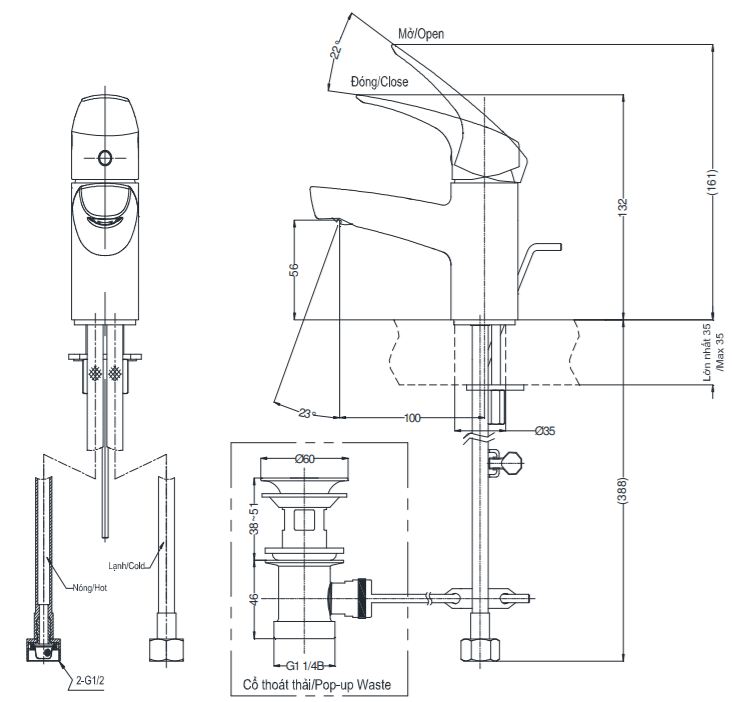 - Áp lực nước: 0.05MPa ~ 0.75MPa