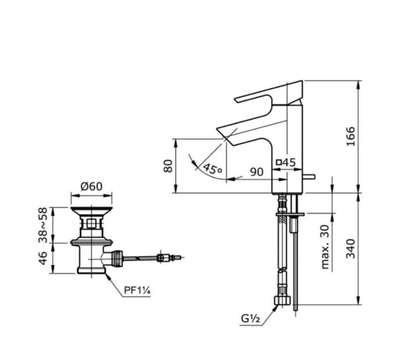 - Kích thước chiều cao vòi xả: 166 mm (H)