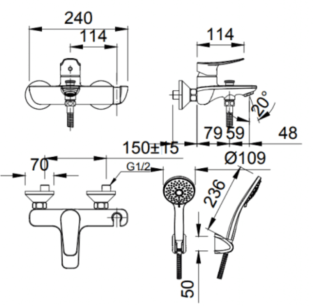 Bản vẽ kĩ thuật của Vòi Sen Tắm Nóng Lạnh INAX BFV-503S.