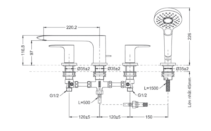 - Vòi xả bồn nóng lạnh kèm sen tắm GA (4 lỗ)