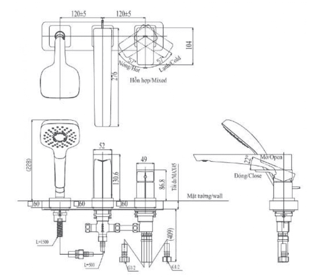 - Vòi xả bồn nóng lạnh kèm sen tắm GE (3 lỗ)