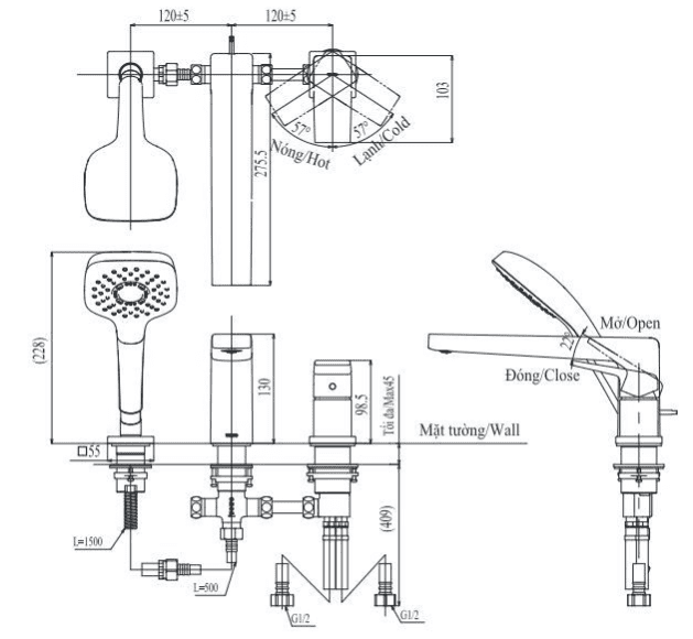 - Vòi xả bồn tắm nóng lạnh kèm sen tắm GB (3 lỗ)