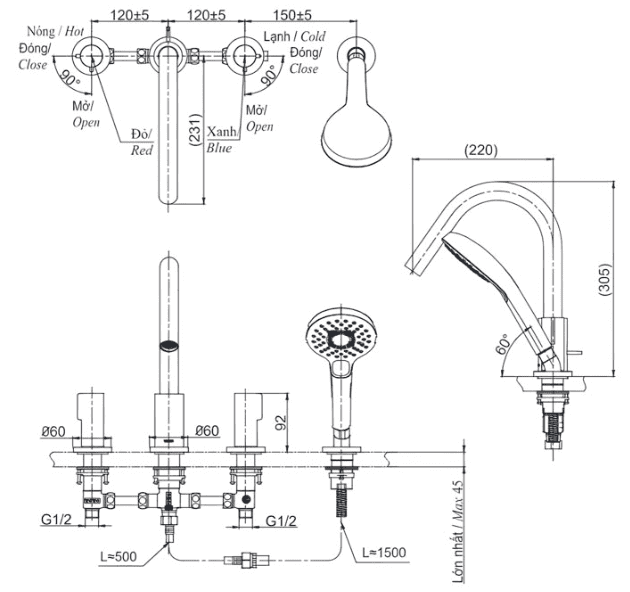 - Áp lực nước: 0.05MPa ~ 1.0MPa