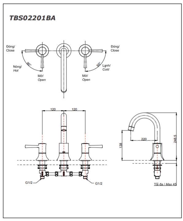Thông số Vòi Xả Bồn TOTO TBS02201BA (TBS02201B) Nóng Lạnh Kèm Sen Tắm